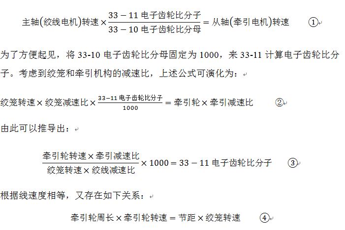 其中,絞籠轉速、節(jié)距由操作者給出,牽引輪周長、牽引減速比和絞線減速比取決于機械結構,由以上公式④推導出牽引輪轉速并帶入公式③,即可求出電子齒輪比分子,在計算的過程中須保證單位統(tǒng)一,計算出的電子齒輪比分子轉化為整數(shù)并通過FC協(xié)議寫入FC302的33-11參數(shù)。