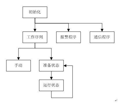 開機后,首先進行通信和狀態(tài)的初始化。初始化完成后同時調用工作序列、報警和通信子程序。工作序列中,包含手動和自動兩種狀態(tài),自動運行又包括機組準備(包括:松開機械抱閘、關閉防護門等動作)和機器運行兩個狀態(tài)。報警程序用于對機器狀態(tài)進行實時監(jiān)控,并根據(jù)故障情況執(zhí)行相關動作。通信程序用于PLC和變頻器的FC協(xié)議通信。