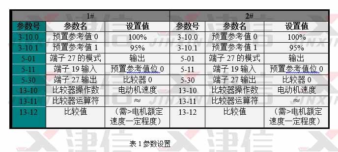 1、1#機(jī)先開機(jī)以100%速度運(yùn)行,端子27接至2#機(jī)的端子19,易知此時(shí)端子27輸出高電平至2#機(jī)的端子19,2#機(jī)開機(jī)則選擇預(yù)置參考值1,以95%速度運(yùn)行;