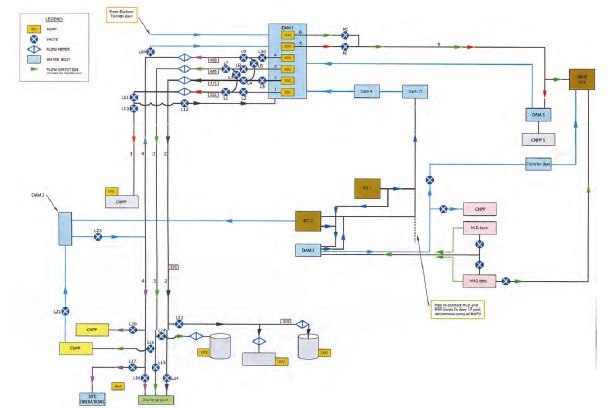 某露天礦場需要考慮三處大型設施中的水資源集中管理和水資源重復利用問題,經過選型和估算,決定建立一個可處理二百萬立方米的水處理設施。示意圖如下: