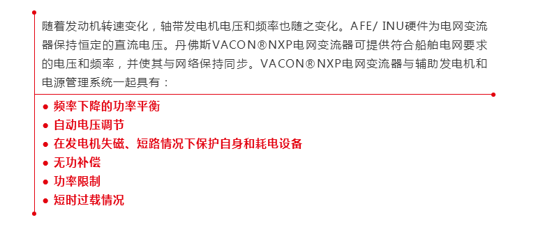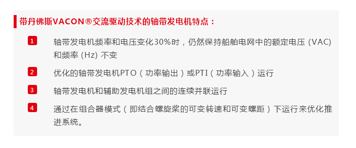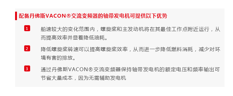 M/V Bore Sea上的軸帶發(fā)電機(jī)的主要原理。丹佛斯VACON®有源前端 (AFE) 單元和船舶電網(wǎng)上的LCL濾波器(以及專(zhuān)用軟件)一同構(gòu)成了VACON® NXP電網(wǎng)變流器。
