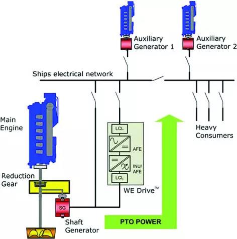 VACON®NXP電網(wǎng)變流器由VACON® AFE單元、船舶電網(wǎng)上的LCL濾波器以及專(zhuān)用軟件組成。集成了AFE/逆變器與VACON®NXP電網(wǎng)變流器的套件被安裝在軸帶發(fā)電機(jī)和船舶電網(wǎng)之間。如圖所示,通過(guò)兩個(gè)輔助發(fā)電機(jī)和軸帶發(fā)電機(jī)的幫助,為重載耗電設(shè)備提供恒壓恒頻的電力。