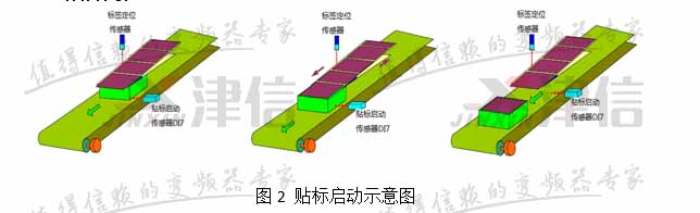 當(dāng)傳送帶上的物品碰到“貼標(biāo)啟動(dòng)傳感器”后,凸輪啟動(dòng),標(biāo)簽軸跟隨主軸移動(dòng),直到貼標(biāo)完成,凸輪軸脫離則由“標(biāo)簽定位傳感器控制”,如圖2所示。